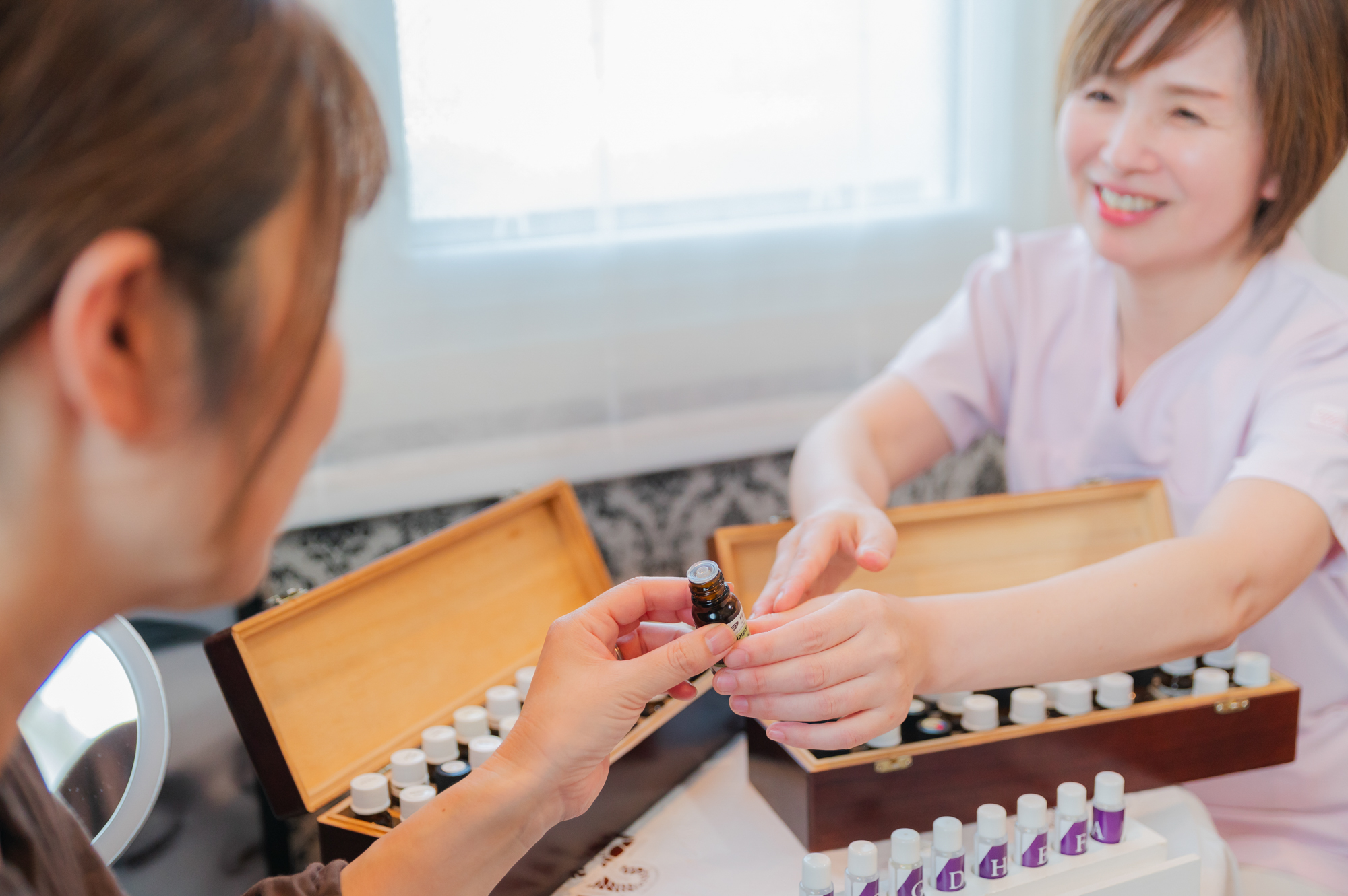 施術の前に嗅覚反応分析チェックを行い、そのときの体調や状態に合わせて60種類の精油の中からお客さまに必要な精油をご提案。